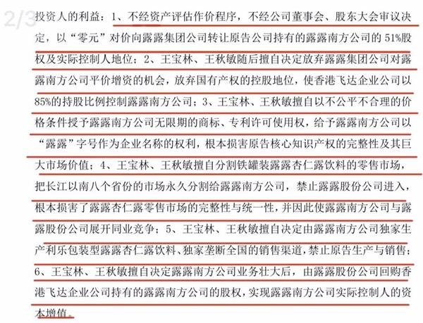 公告详细列出两人6条损害公司和投资者权益的行为。包括不经资产评估作价程序,不经公司董事会、股东大会审议决定,以“零元”对价转让原告公司持有的露露南方公司的51%股权及实际控制人地位等。