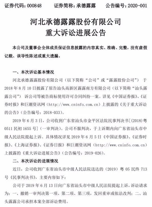 在2019年年度报告的公司未来发展展望中,承德露露除了表示研发新产品、拓展产能外,还将“持续推进公司与汕头高新区露露南方有限公司关于商标等系列案件的诉讼进展,争取早日解决商标等侵权问题”列入了工作重点列表中。