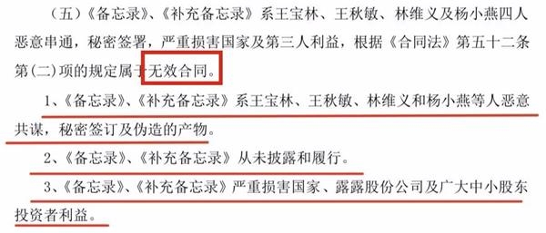 在今年1月5日承德露露发布的重大诉讼进展公告中,关于为何认定两份备忘录为无效合同有详细表述。