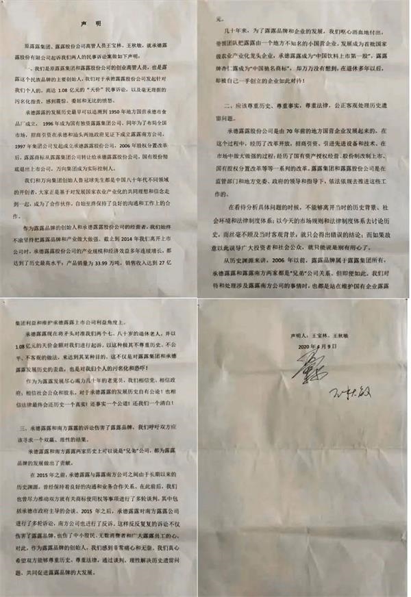 针对这一起诉,两位原高管日前在朋友圈发布了一份书面声明。两人在声明中表示,对于承德露露指责,感到“震惊、委屈和无比地愤怒”。