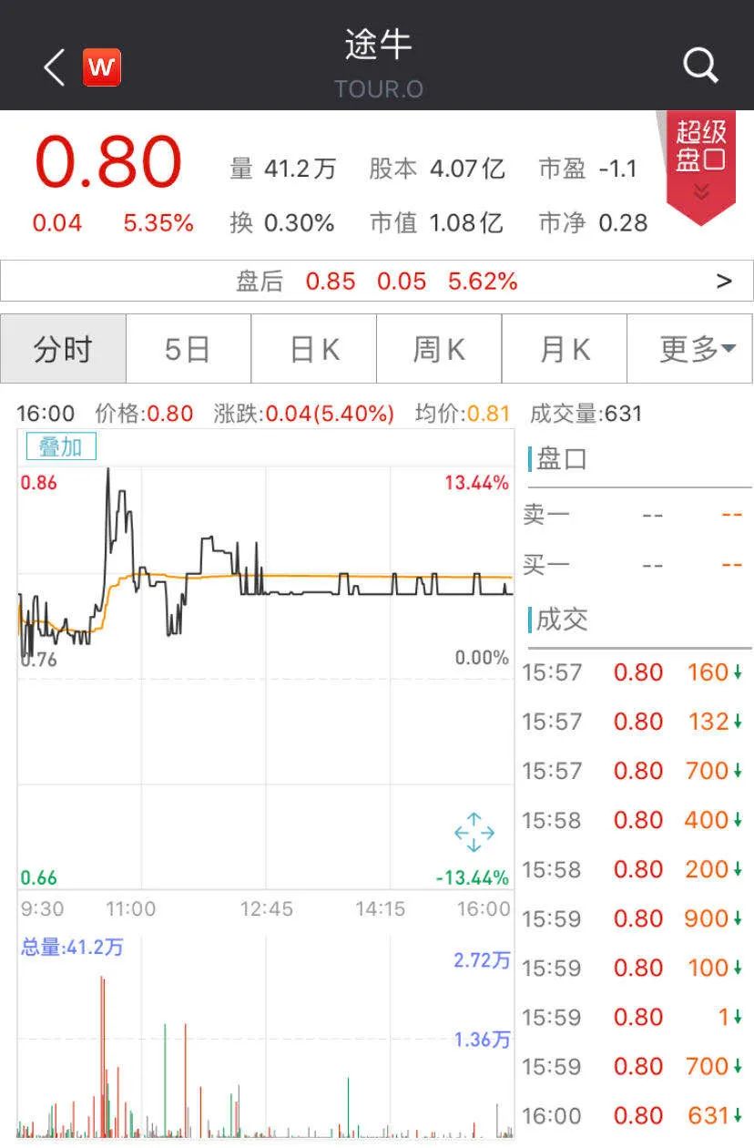 截至当地时间周二收盘,途牛涨5.35%,股价为0.80美元,市值为1.08亿美元。